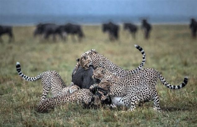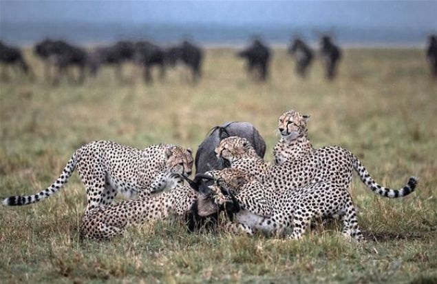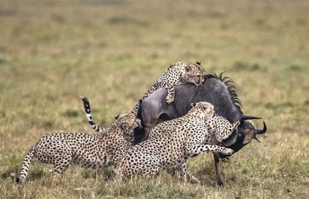 5 çitanın birlikte çalışarak yakaladıkları antilobu dakikalar içinde etkisiz hale getiriyor.