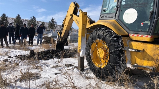 Kısa süre içinde köye varan kepçe, donmuş toprağı kazdı. İş makinesinin çalışması sonucu donmuş toprak yarım saatte kazılarak mezar hazır hale getirildi.