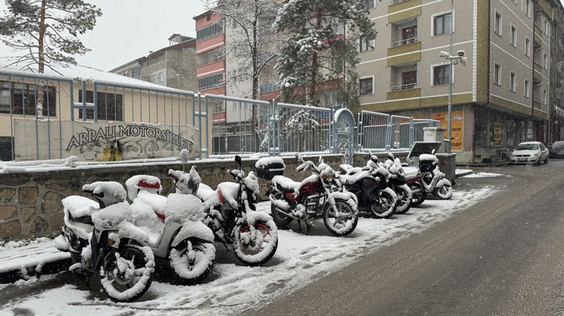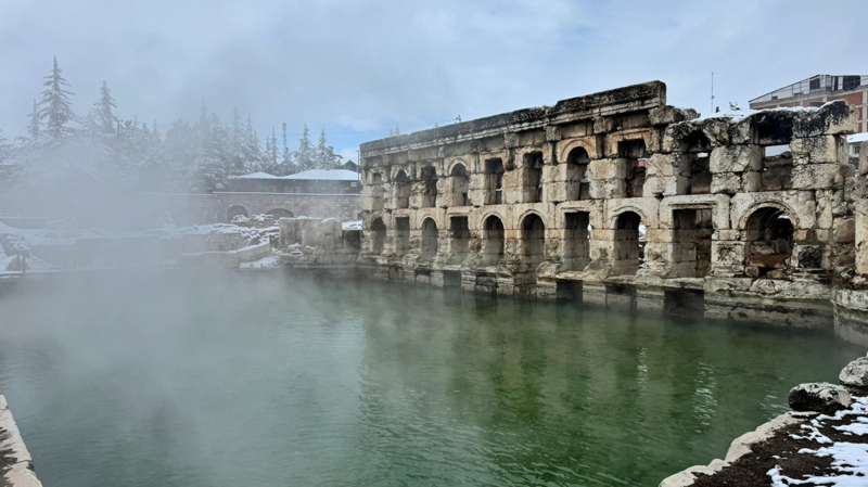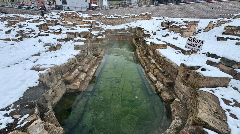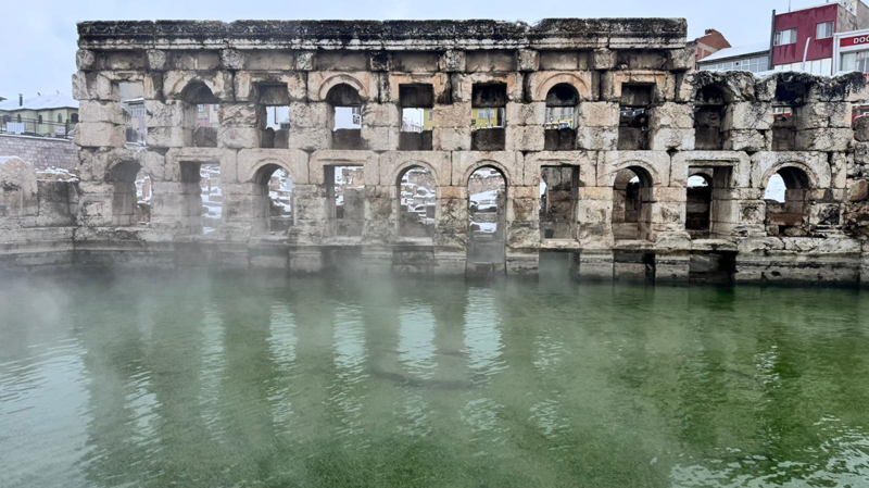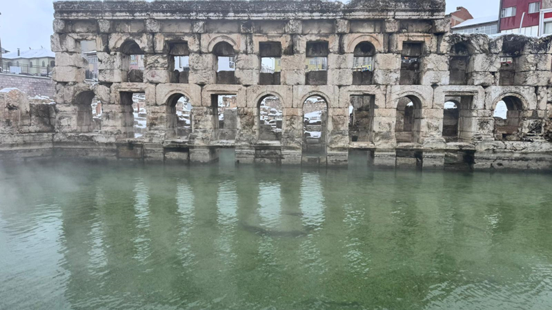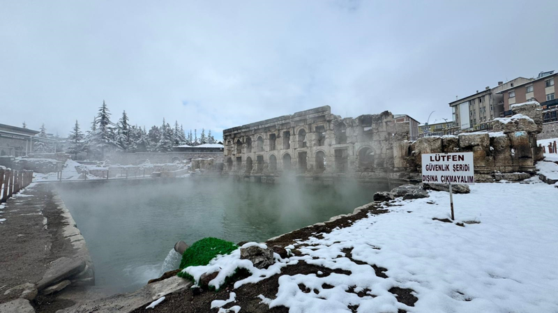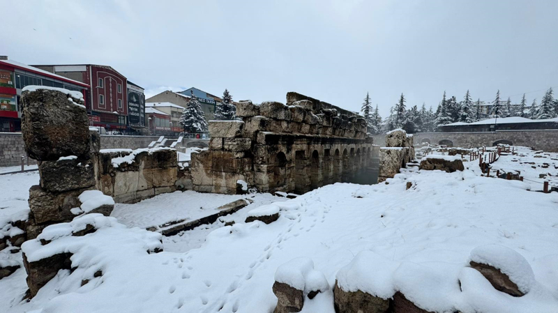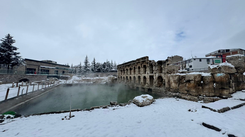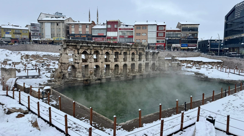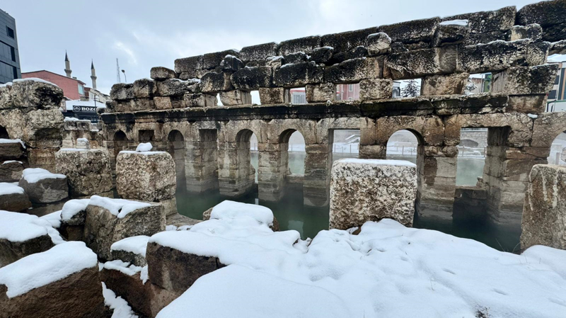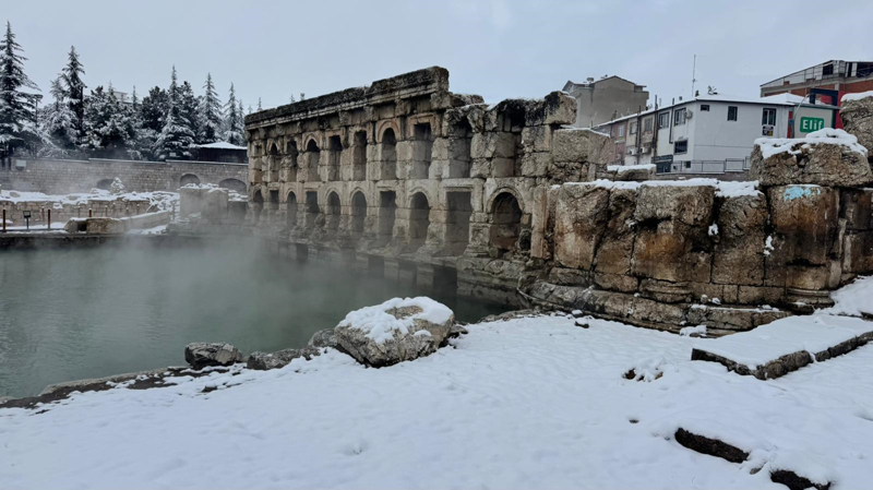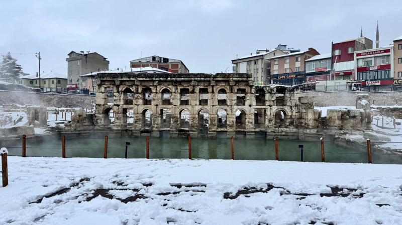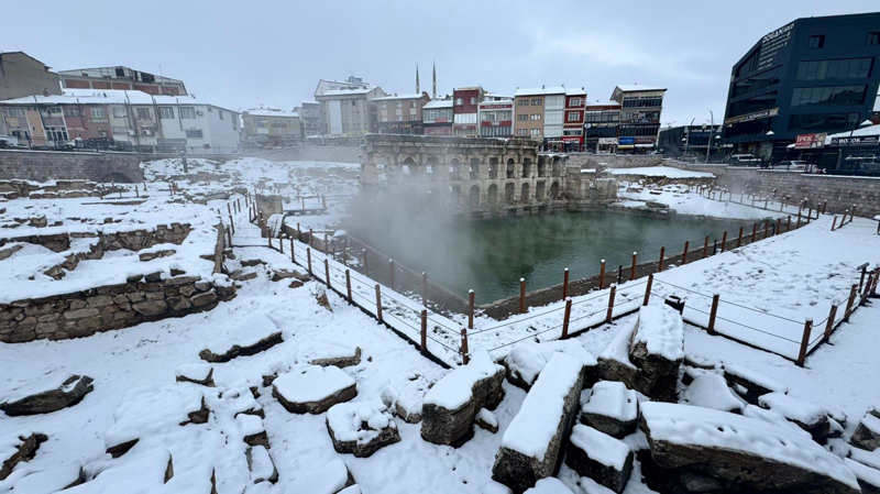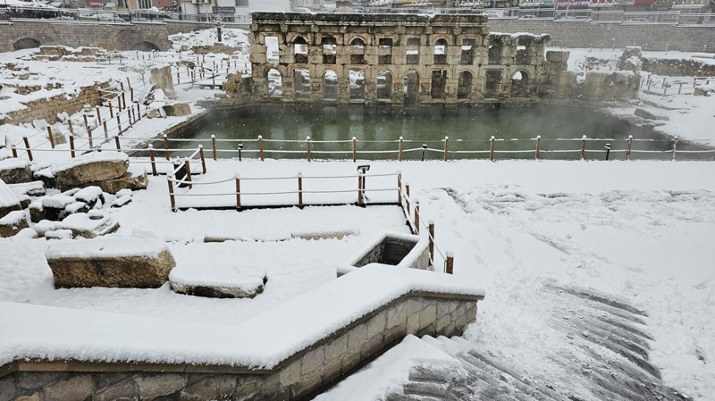 Yozgat'ta gece saatlerinde başlayan kar yağışı etkili oldu. Kar yağışının ardından Sarıkaya ilçesinde yer alan Basilica Therma Roma Hamamı ve çevresi beyaza büründü.