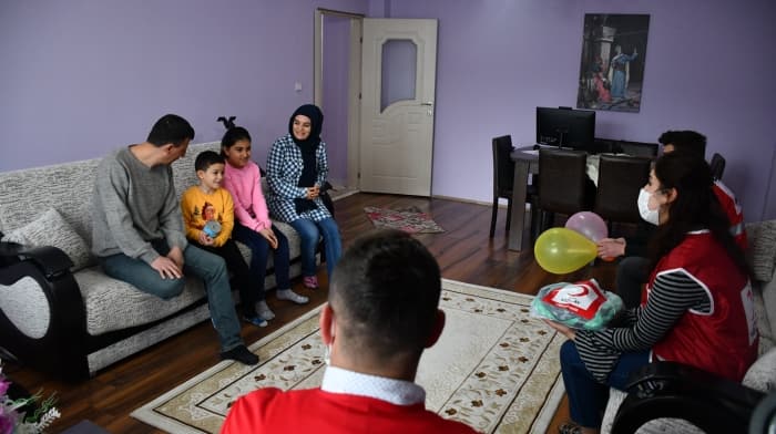 Akça ailesinin evine gelen Türk Kızılay gönüllüleri, kampanya hesabına yatırmak üzere kumbarayı teslim aldıktan sonra kardeşlere çeşitli hediyeler verdi.