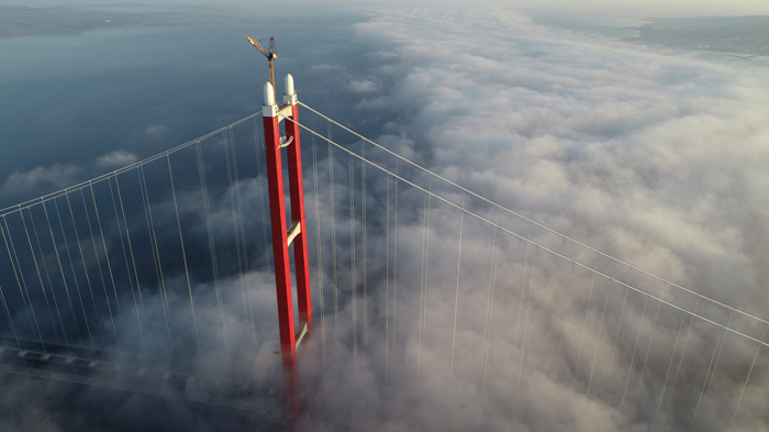 Sisle etkileyici bir manzaraya bürünen 1915 Çanakkale Köprüsü, dron ile görüntülendi.