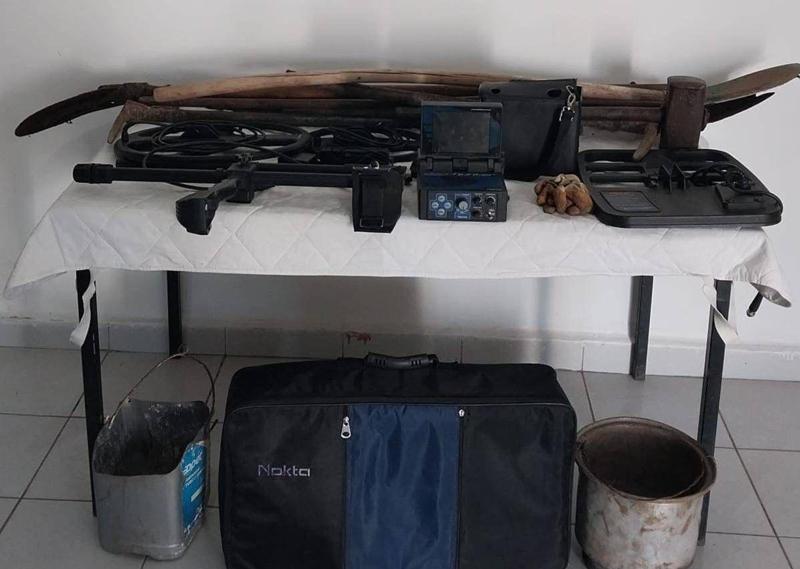 Zanlıların kazıda kullandığı 2 metal arama dedektörü ve aparatı, dijital dedektör göstergesi ve çantası, balyoz, 3 kürek, 3 murç, 2 kazma, 1 çekiç, 1 inşaat eldiveni ve 2 kova ele geçirildi.