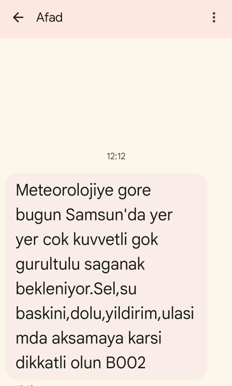 "Meteorolojiye göre bugün Samsun'da yer yer çok kuvvetli gök gürültülü sağanak bekleniyor. Sel, su baskını, dolu, yıldırım, ulaşımda aksamaya karşı dikkatli olun."