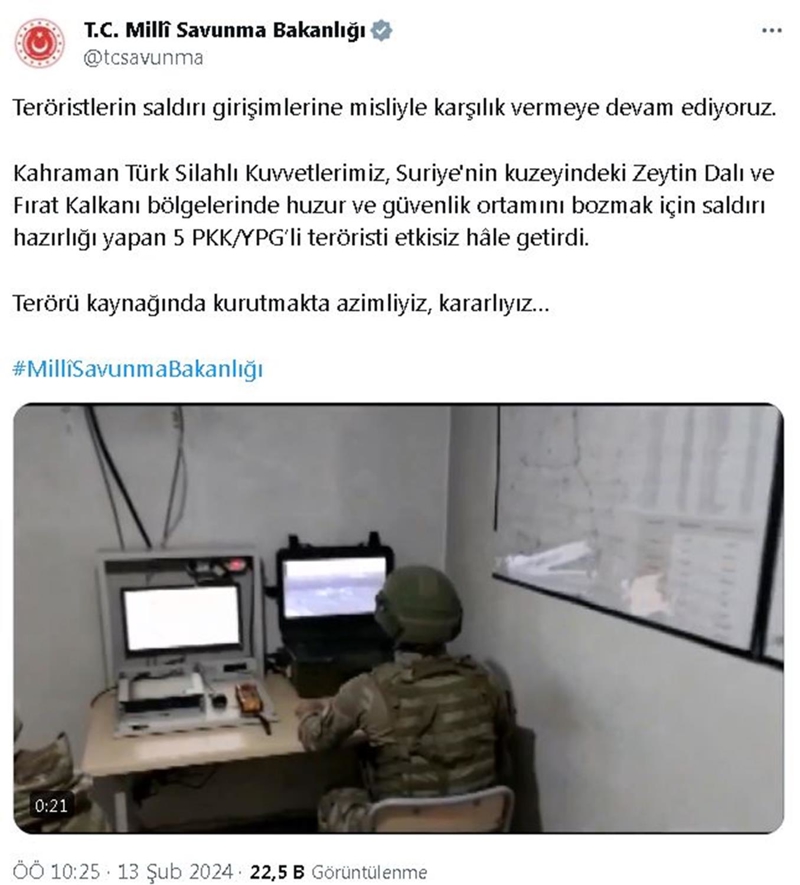 Bakanlıktan yapılan açıklamada, "Teröristlerin saldırı girişimlerine misliyle karşılık vermeye devam ediyoruz. Kahraman Türk Silahlı Kuvvetlerimiz, Suriye'nin kuzeyindeki Zeytin Dalı ve Fırat Kalkanı bölgelerinde huzur ve güvenlik ortamını bozmak için saldırı hazırlığı yapan 5 PKK/YPG'li teröristi etkisiz hale getirdi. Terörü kaynağında kurutmakta azimliyiz, kararlıyız." ifadeleri kullanıldı.