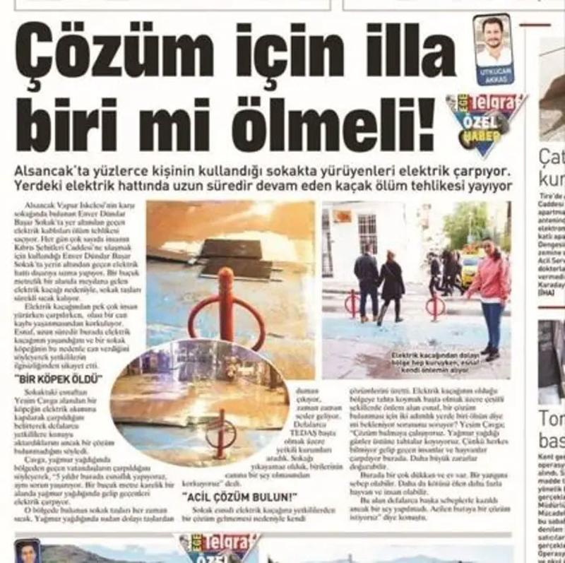 Yerel Ege Telgraf gazetesinin yer altındaki kabloların tehlike saçtığını 19 Ocak 2019'de gündeme getirdiği ortaya çıktı. Olayın yaşandığı Enver Dündar Başar Sokak'ın adının bile verildiği haberde elektrik hattının dışarıya sızma yaptığına dikkat çekildiği; 'Çözüm için illa biri mi ölmeli" şeklinde de başlık atıldığı görüldü.