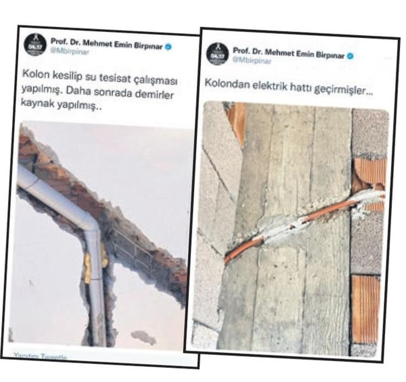 Çevre, Şehircilik ve İklim Değişikliği Bakan Yardımcısı Mehmet Emin Birpınar, Hatay'da hasar tespit çalışmaları ve binalardan örnekler toplanmasında göze çarpan çarpıcı fotoğrafları paylaştı. Felakete davetiye çıkaran tesisat ihmalkârlıklarını ve kurnazlıklarını ortaya koyan Birpınar'ın Twitter adresinden paylaştığı görseller, tesisat çalışması adı altında binalara verilen zararları gözler önüne serdi.