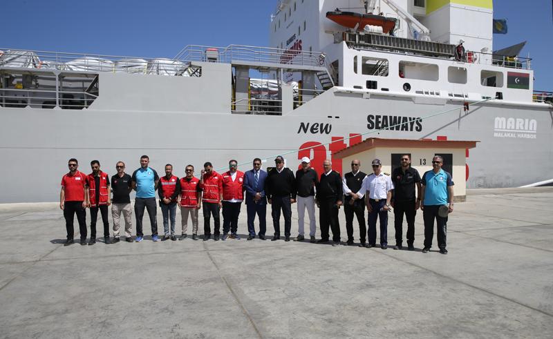 Limana yanaşan gemiden indirilecek 3 bin 774 ton insani yardım malzemesi, tır ve kamyonlarla Refah Sınır Kapısı'na taşınacak.