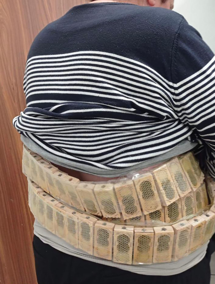 Şüphelinin beline sarılı vaziyette çok sayıda küçük ahşap kutu olduğu görüldü. Yapılan incelemede, 110 kutunun her birinde 1 kraliçe ve 9 işçi arı olduğu belirlendi. Ekiplerce 1100 arıya el konuldu.