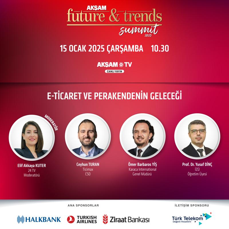 Akşam Future&Trends Summit; Ülkemizde ve dünyada finanstan sigortaya, inşaat, çevre ve şehircilikten e-ticaret ve perakendeye kadar sektörlerin gelecek planlarını ve trendlerini kapsamlı bir şekilde konuşmak üzere kamu, finans ve iş dünyasından üst düzey yöneticileri ve sektörün tüm paydaşlarını bir araya getiriyor.