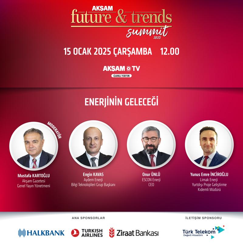 Enerjinin Geleceği başlıklı son oturumda ise Akşam Gazetesi Genel Yayın Yönetmeni Mustafa Kartoğlu moderatörlüğünde; Aydem Enerji Bilgi Teknolojileri Grup Başkanı - Engin Kavas, ESCON Enerji CEO - Onur Ünlü, Limak Enerji Yurtdışı Proje Geliştirme Kıdemli Müdürü - Yunus Emre İnciroğlu ile enerji sektörünün bugünü ve gelecekteki yönelimleri hakkında konuşulacak.