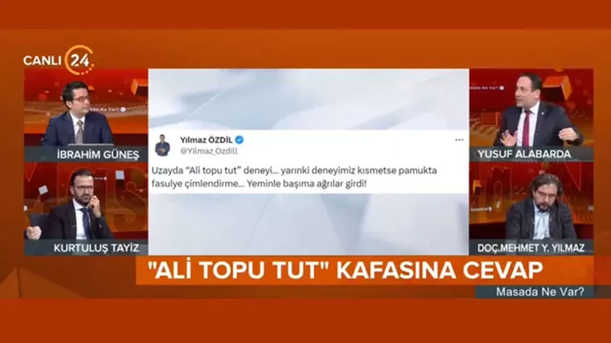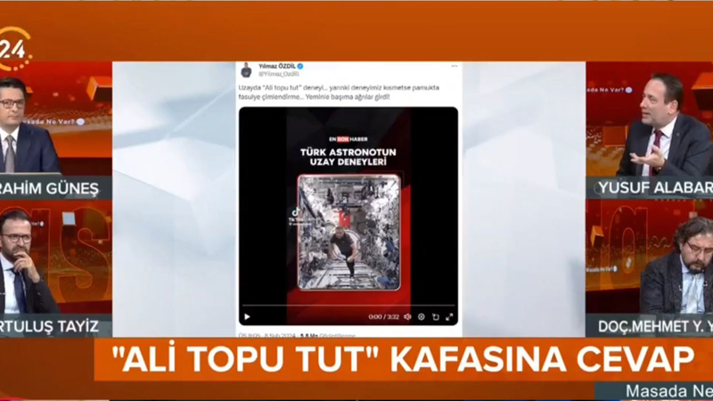 24 TV'de İbrahim Güneş'in sunduğu "Masada Ne Var?" programında, Akşam Gazetesi Yazarı Yusuf Alabarda, sözde gazeteci Yılmaz Özdil'in Türkiye'nin ilk astronotu Alper Gezeravcı'nın uzayda yapmış olduğu deneylerle ilgili sosyal medya hesabından yaptığı skandal paylaşımlarına canlı yayında sert tepki gösterdi.