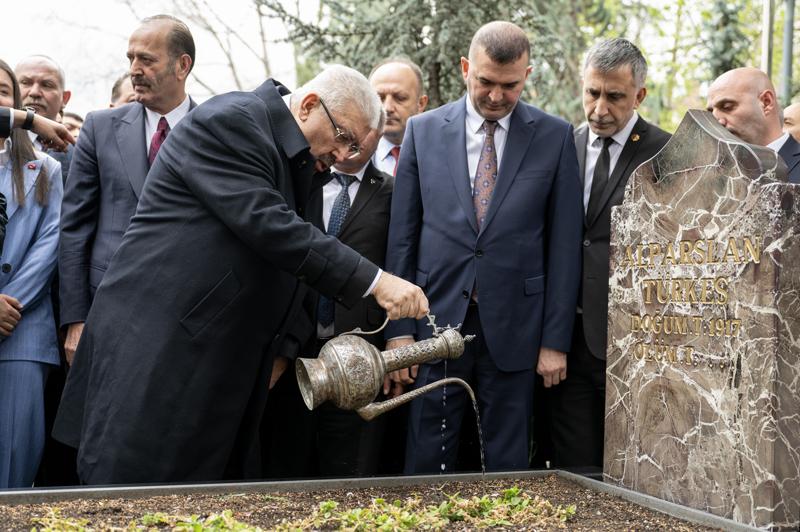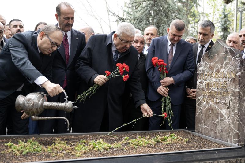 Yalçın, Alparslan Türkeş'in mezarına karanfiller bıraktı, bakır ibrikle su döktü.