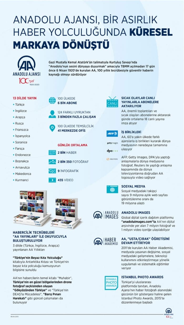 100 ülkede 6 bin basın kuruluşuna hizmet veren, 124 farklı uyruktan 3 binden fazla çalışanıyla günlük 2 bin haber, 2 bin 350 fotoğraf, 9 infografik, 435 video yayınlayan AA, kuruluşunun 100. yılında dünyanın en saygın ajansları arasında yer alıyor.