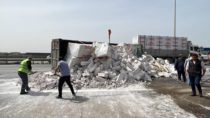 Çarpmanın etkisiyle Alaattin E. idaresindeki yapı malzemesi yüklü kamyon devrildi.