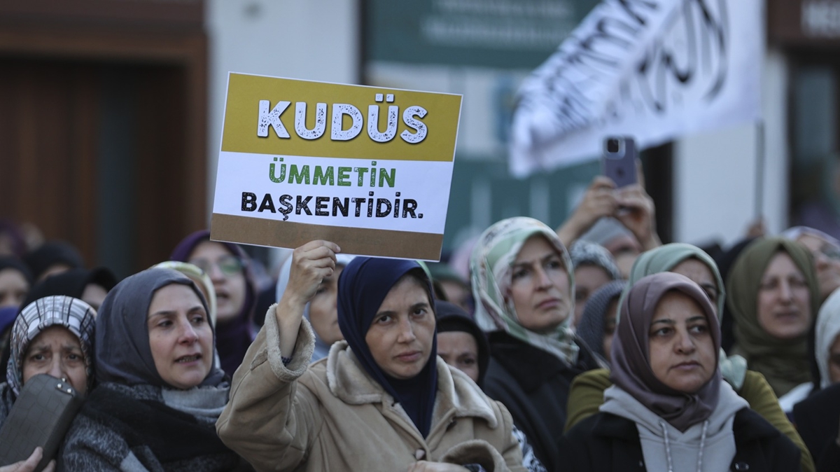 Namazın ardından cami önünde toplanan bazı vakıf ve dernek üyeleri ise ellerinde Filistin bayraklarıyla "Özgür Filistin, özgür Kudüs" sloganları attı.