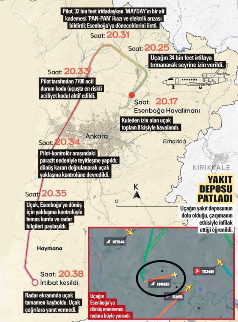 Libya Genelkurmay Başkanı Orgeneral Muhammed Ali Al-Haddad dâhil 5 kişilik askeri heyeti taşıyan Falcon-50 tipi özel jetin Haymana'da düşmesiyle ilgili yeni bilgilere ulaşıldı. Ankara Esenboğa Havalimanı'ndan Trablus'a gitmek üzere saat 20.17'de havalanan uçağın 32 bin 400 fit irtifaya ulaştıktan sonra hava kontrol merkeziyle irtibat kurduğu; elektrik arızasından kaynaklı 'acil durum' bildirdiği öğrenildi. 'Acil iniş' talebinde bulunarak geri dönen uçak, Haymana'ya bağlı Kesikkavak Köyü'nün 2 km güneyindeki bir tepeye düştü. Enkaz bölgesinde basın açıklaması yapan İçişleri Bakanı Ali Yerlikaya, kaza-kırım nedeniyle 3'ü mürettebat 8 kişinin hayatını kaybettiği belirtti.