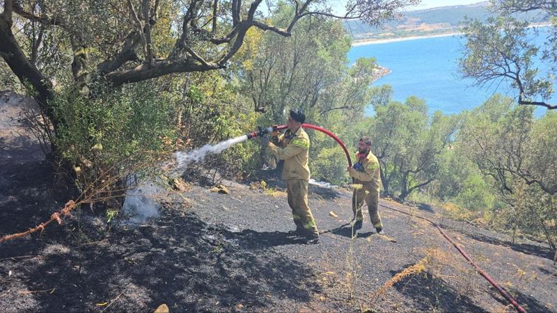Ekiplerin müdahalesiyle kontrol altına alınan yangında 8 dönümlük zeytinlik alanda zarar oluştu. Bölgedeki soğutma çalışmaları sürüyor.