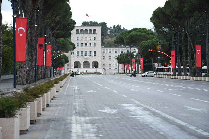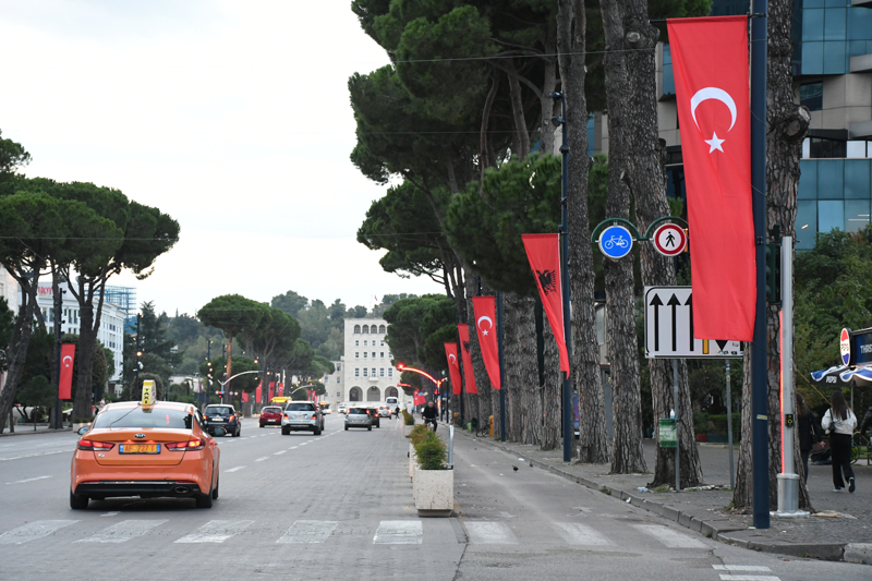 Cumhurbaşkanı Erdoğan'ın Arnavutluk ziyaretinde kullanacağı güzergaha ve Tiran'ın merkezindeki "Rahibe Teresa" meydanına iki ülkenin bayrakları asıldı.