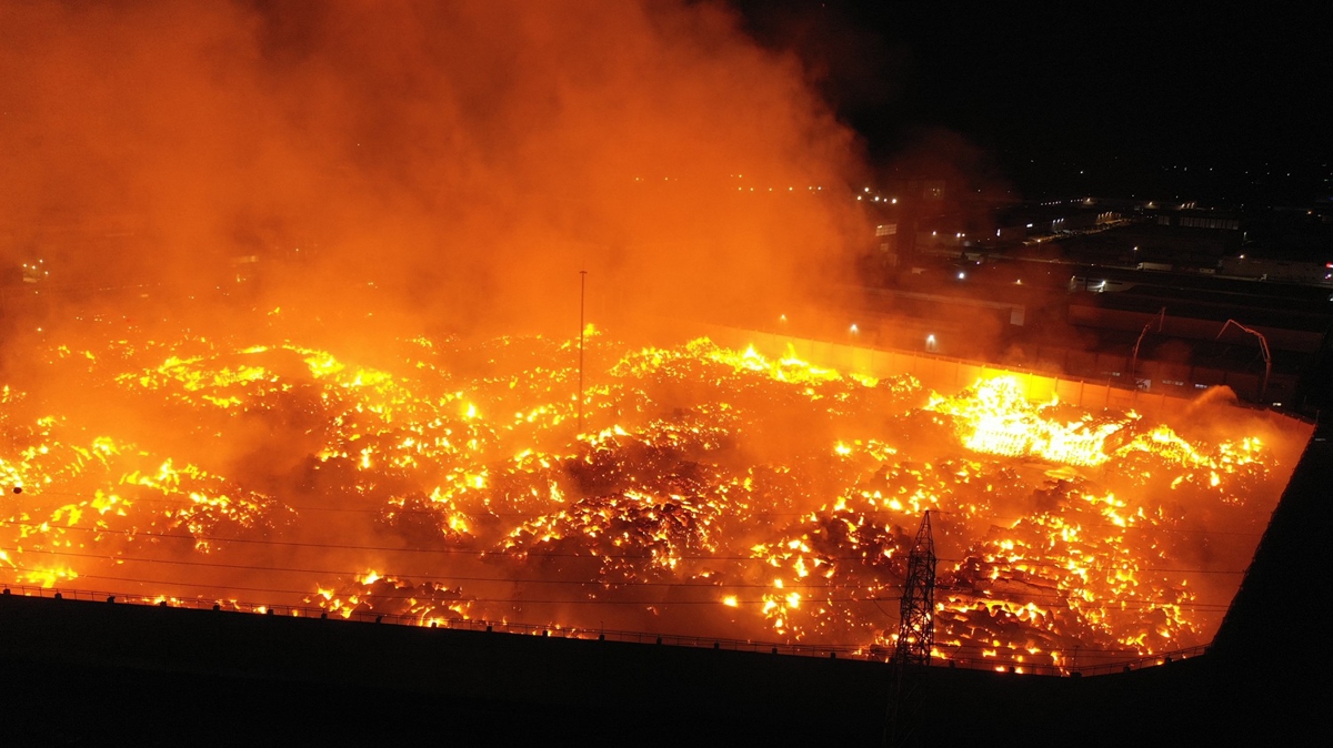 Ekiplerin, alevlerin fabrikanın ana üretim hattına sıçramaması için önlem aldığı görülüyor.