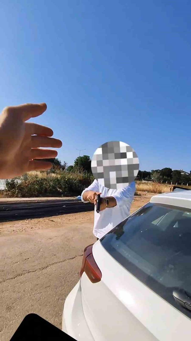 Kask kamerasıyla çekilen ve sosyal medyada paylaşılan görüntüye göre, Mahmut Esatbey Caddesi'nde trafikte seyreden bir otomobil sürücüsü, onu sıkıştırdığı için aracının aynasına çarparak yoluna devam eden motosikletliyi takibe başladı. Bir süre sonra Ahmet Türkel Çevre Yolu'nda motosikletinin önünü kesen otomobil sürücüsü, elindeki tabancayı doğrultarak tehdit etti.