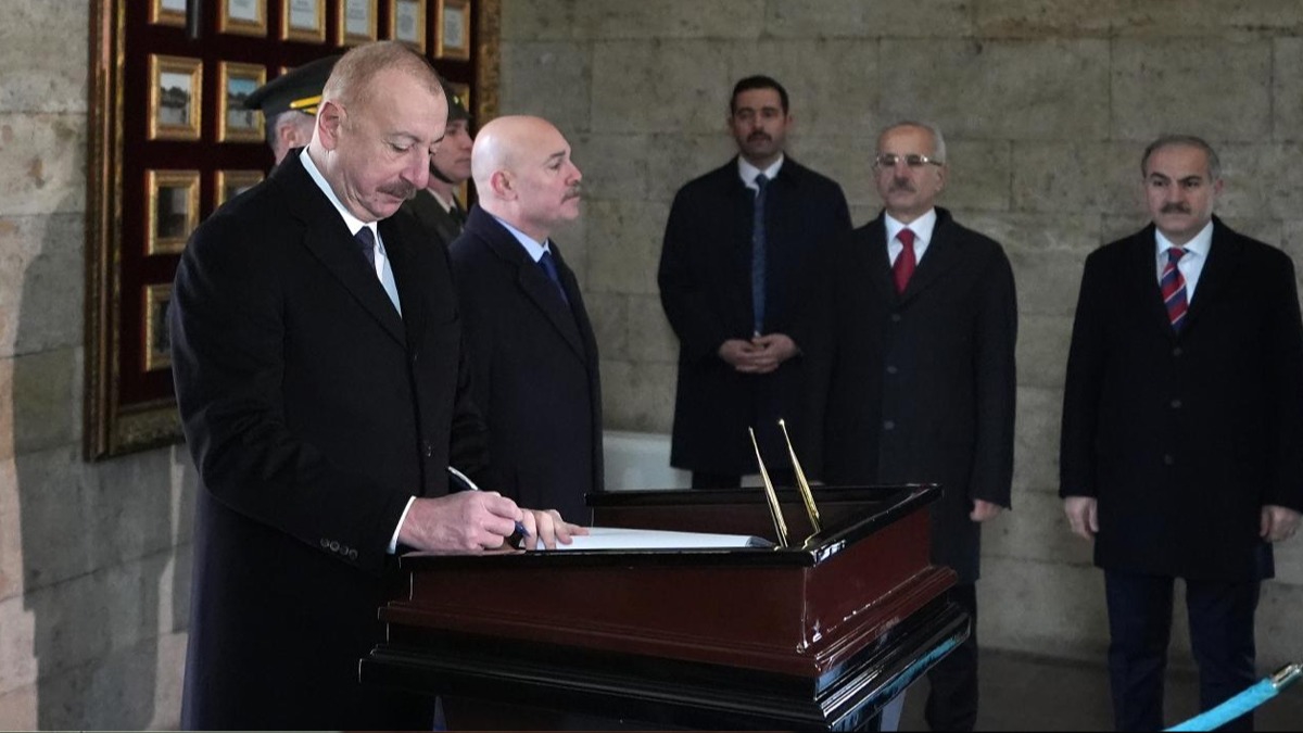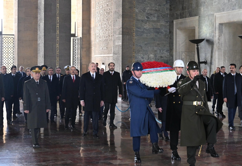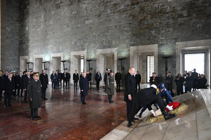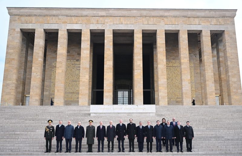 Gazi Mustafa Kemal Atatürk'ün mozolesine çelenk bırakarak saygı duruşunda bulunan Aliyev, ziyaretin ardından hatıra fotoğrafı çektirerek Anıtkabir Özel Defteri'ni imzaladı.