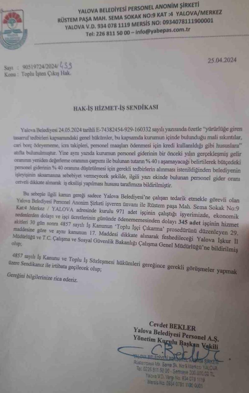"Yalova Belediyesi, yürürlüğe giren tasarruf tedbirleri çerçevesindeki genel hükümler, bu çerçevede kurumun içinde bulunduğu mali sıkıntılar, cari borç ödeyememe, icra takipleri, personel maaşları ödenmesi için kredi kullanıldığı gibi hususlara' atıfta bulunulmuştur. Yine aynı yazıda kurumun personel giderinin bir önceki yılın gerçekleşmiş gelir oranının yeniden değerleme oranının çarpımı ile bulunan tutarın yüzde 40'ı aşamayacağı belirtilmiştir. Bütçedeki personel giderinin yüzde 40 oranına düşürülmesi için gerekli tedbirlerin alınması istenildiğinden belediyenin işleyişinin aksamasına sebebiyet vermeyecek şekilde, ilgili yazı ekinde bulunan personel gider oranı cetveli dikkate alınarak iş eksilişi yapılması hususu tarafımıza bildirilmiştir. Bu sebeple ilgili kanun gereği sadece Yalova Belediyesi'ne çalışan tedarik etmekle görevli olan Yalova Belediyesi Personel Anonim Şirketi işveren unvanı ile Rüstem paşa Mah. Sema Sokak No:9 Kat:4 Merkez / Yalova adresinde kurulu 971 adet işçinin çalıştığı işyerimizde, ekonomik sebeplerden dolayı ve işçi ücretlerinin gününde ödenememesinden dolayı 345 adet işçinin hizmet akitleri 30 gün sonra 4857 sayılı İş Kanunun 'Toplu İşçi Çıkarma' prosedürünü düzenleyen 29. maddesine göre ve aynı kanunun 17. Maddesi dikkate alınarak feshedileceği Yalova İş-Kur İl Müdürlüğü ve T.C. Çalışma ve Sosyal Güvenlik Bakanlığı Çalışma Genel Müdürlüğü'ne bildirilmiş olup; 4857 sayılı İş Kanunu ve Toplu İş Sözleşmesi hükümleri gereğince gerekli görüşmeler yapmak üzere sendikanız ile irtibata geçilecek olup, gereğini bilgilerinize rica ederiz."