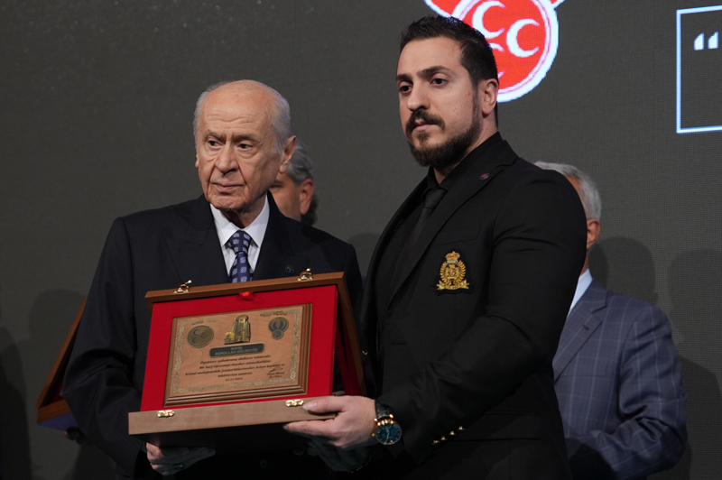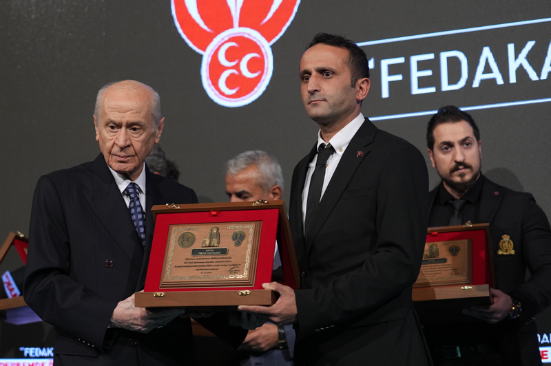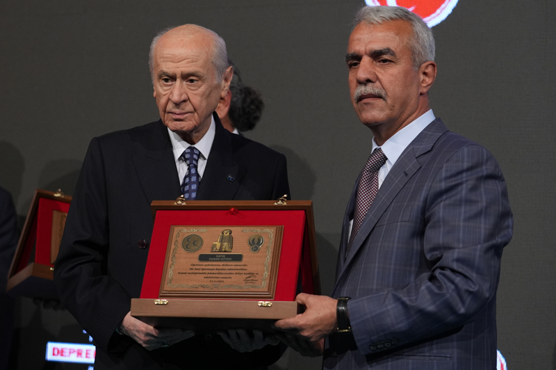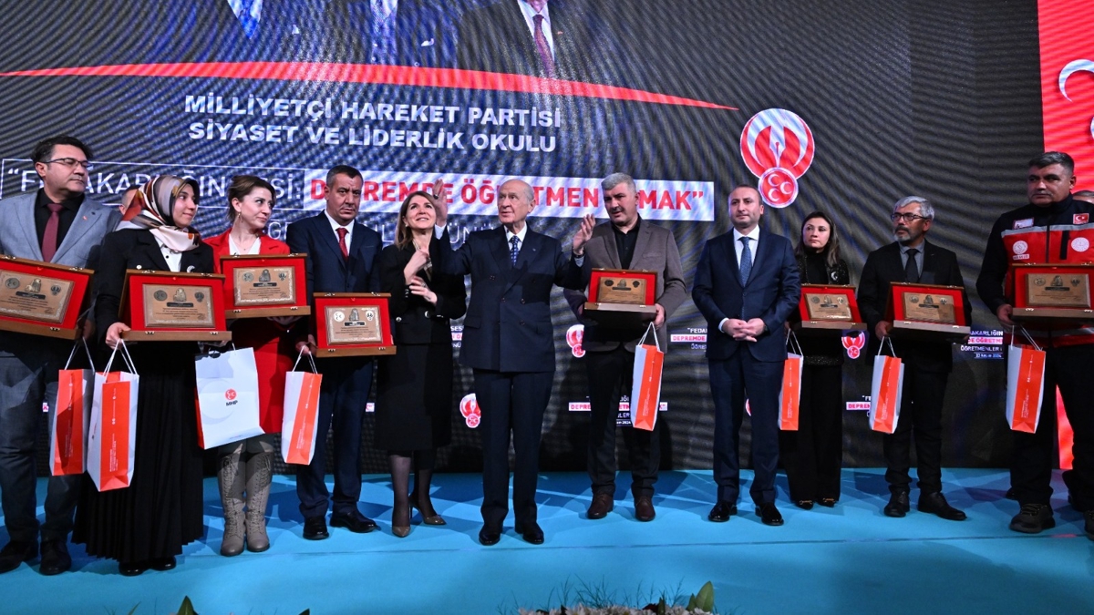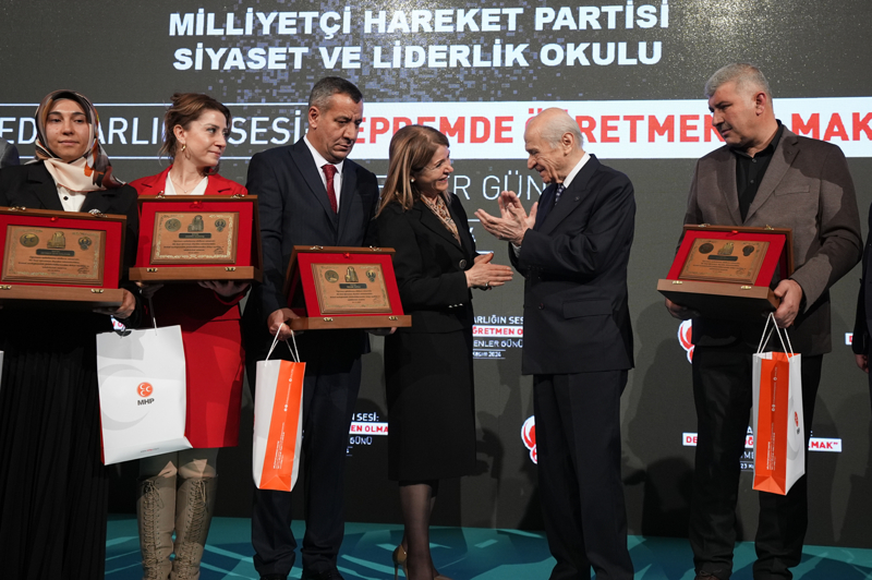 Program sonunda MHP Genel Başkanı Bahçeli, deprem bölgesindeki özverili çalışmaları nedeniyle öğretmenlere hediye plaketleri verdi. Gözyaşlarına hakim olamayan bir öğretmene plaket veren Bahçeli'nin de gözleri doldu.