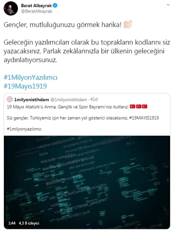 Bakan Berat Albayrak, Twitter hesabından Hazine ve Maliye Bakanlığı'nın 1 Milyon İstihdam sayfasının paylaştığı videoyu alıntılayarak, "Gençler, mutluluğunuzu görmek harika. Geleceğin yazılımcıları olarak bu toprakların kodlarını siz yazacaksınız. Parlak zekalarınızla bir ülkenin geleceğini aydınlatıyorsunuz" ifadelerini kullandı.