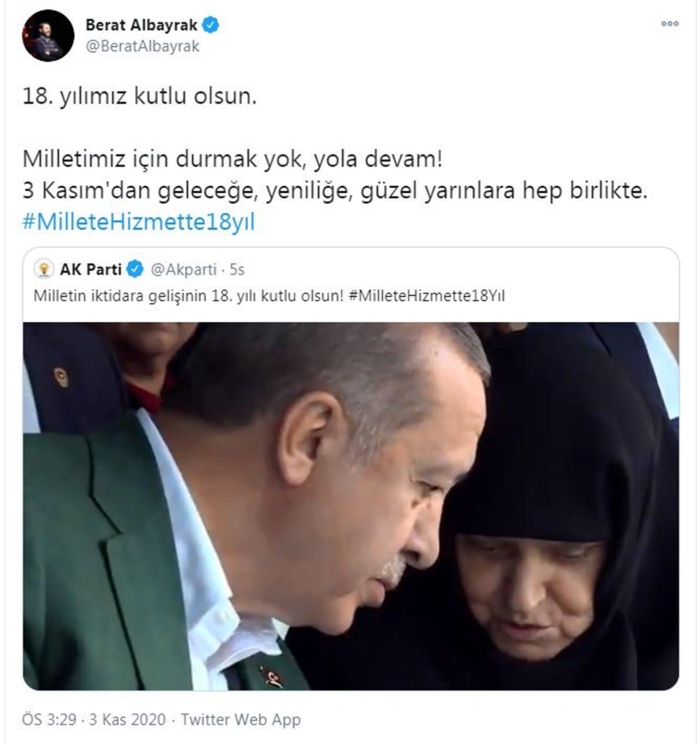 Bakan Albayrak, Twitter hesabından, AK Parti'nin iktidara gelişinin 18'inci yılına özel hazırladığı videoyu paylaştı. Bakan Albayrak, paylaşımdaki mesajında, "18'inci yılımız kutlu olsun. Milletimiz için durmak yok, yola devam. 3 Kasım'dan geleceğe, yeniliğe, güzel yarınlara hep birlikte" ifadesini kullandı.