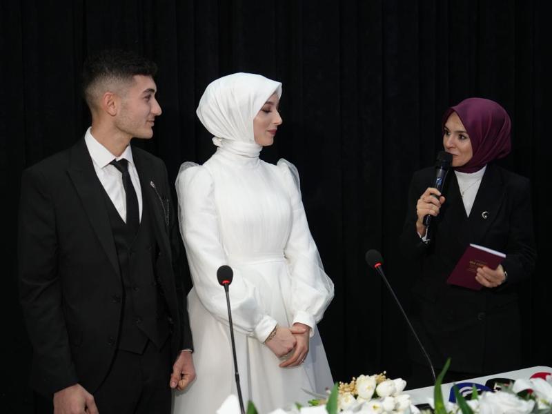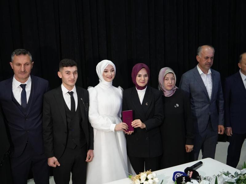 Çifte takı takarak evlilik cüzdanlarını veren Bakan Mahinur Özdemir Göktaş, mutluluk dileyerek, "Bugün Eray ve Zümrete çiftinin nikah merasimindeyiz. Bizim için çok kıymetli, biliyorsunuz bu yılı Aile Yılı ilan ettik. Aile Yılı kapsamında, gençlerimizi evlendirme yolunda da Aile ve Gençlik Fonunu tüm Türkiye'ye yaygınlaştık. Eray ve Zümrete bu fondan istifade eden Kastamoulu çiftlerimizden bir tanesi. Bizler de onların bu mutlu gününde şahitlik etmekten gerçekten mutluluk duyuyoruz. Ömür boyu mutluluk diliyoruz. Rabbim iki cihan mutluluk nasip eylesin, her türlü güzellikleri yaşamayı nasip eylesin. Evlilik eğitim programlarına katıldılar. Meşakkatli bir yoldu. Ama bundan sonra bizler de her zaman yanınızdayız. Ben bu evlilik cüzdanını sizin gibi güzel bir aileye veriyorum. Her zaman güzel günleriniz olsun, inşallah. Zor günleriniz de olur belki ama onları da Evlilik Öncesi Eğitim Programı'nda gördüğünüz gibi savurla üzerinden geleceğinize inanıyorum" dedi.