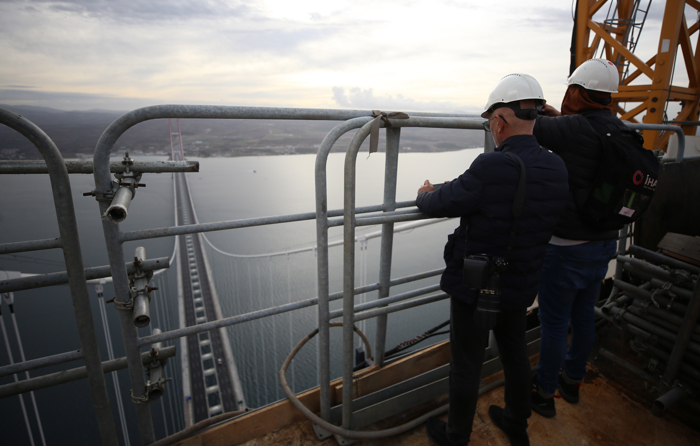 Bakan Karaismailoğlu, gazetecilere yaptığı açıklamada, bir gurur projesinin en üst noktasında olduklarını dile getirdi. Adil Karaismailoğlu, "Biz 318 metreyi artık bugün itibariyle 334 metreye çıkardık. Hem iki kulenin ayaklarında sağda solda hem de diğer ayaklarda Seyit Onbaşı'nın top mermilerinin figürlerini yerleştirmiş olduk. Artık deniz yüzeyinde 334 metrelik ayak yüksekliklerimiz var. Ama bizim deniz altında da 45 metre su derinliği ve bu derinliğin altında da 50 metreye uzayan 370 adet kazıklarımız var. 65 bin ton ağırlığındaki beton kesonlar ve onun üzerinde 33 adet bloktan oluşuyor. Bir puzzle parçası olarak 318 metreye kadar ulaşmıştık. Şu anda mermi figürleriyle beraber 334 metreye çıkmış bulunuyoruz." dedi.