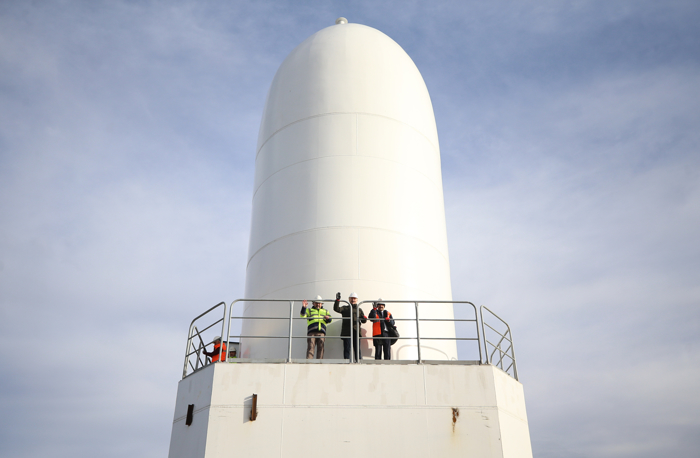 Köprünün Avrupa yakasındaki kulesinde 318 metre yükseklikte bulunan bölümüne asansörle çıkan Karaismailoğlu burada teknik ekipten bilgi aldı.