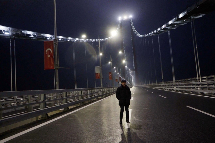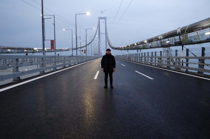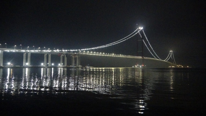 "Bu köprü çok muhteşem bir köprü. Bir abide gibi Çanakkale'de yükseldi. 18 Mart'ta açılması ve şehit kanlarıyla sulanmış Çanakkale'de böyle bir eserin ortaya çıkması, yüz yıllar boyunca bu ülkeye hizmet edecek kıymetli eserin açılışı ve buraya katkıda bulunan tüm arkadaşlarımla, Türkiye Cumhuriyeti vatandaşlarının gurur duyacağı bir projeyi yarın hizmete açıyoruz. Köprümüz sembollerin köprüsü. 18 Mart, 3. ayın 18'i. 318 metre çelik ayak yüksekliği. 2023 metre iki çelik ayak arası açıklığı ile Cumhuriyetimizin 100. yılına ithafen, Seyit Onbaşı'nın 16 metrelik simge top mermileriyle 334 metreye kadar çıkacak çok önemli bir eser. İçinde binlerce matematik formülünü barındıran teknolojik ve mühendislik açısından aslında bir deha ürünü. Böyle kıymetli bir eseri Türkiye Cumhuriyeti'ne ve dünyaya kazandırmanın mutluluğunu yaşıyoruz. O yüzden çok sabırsızlanıyoruz. Şu anda köprünün tam ortasındayız ve gün doğumunu köprünün ortasında karşıladık."