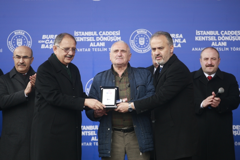 "Bunlardan biri eksik kalırsa kentsel dönüşüm başarılamaz. Birincisi bakanlık, ikincisi belediye, üçüncüsü de vatandaş tarafı bu işin. Bakanlık olarak Sayın Cumhurbaşkanı'mızın talimatıyla yasalar çıkarıyoruz. Özel bütçeler koyuyoruz. Kendi içimizde biz teşkilat şemamızı yeniliyoruz. Sonuna kadar bu konuda hazırlıklarımızı yapıp kentsel dönüşümün önünü açacak her ne varsa hepsini yerine getiriyoruz. İstekliyiz. Her gittiğim yerde açık duyuruda bulunuyorum. Diyorum ki 'Belediye başkanlarımız hangi partili olursanız olun kapı sonuna kadar açık size. A partili, B partili, C partili, hangi partiliyseniz gelin. Burada sizin bir kardeşiniz oturuyor. Elimde ne imkan varsa sizlerle paylaşacağım. Arsa mı lazım? Arsa vereceğim. Para mı lazım? Para vereceğim. Arkanızda durmak mı icap ediyor? Yasa çıkarmak mı icap ediyor? Onu da yapacağız. Yeter ki sizler bu işi yapın.' Evet, bakanlık olarak biz hazırız. Bu duyuruda her zaman bulunuyoruz ama belediye ayağımız zayıf bizim. Bir kısım arkadaşlarımız var. (Bursa Büyükşehir Belediye Başkanı) Alinur Bey, binlerce konutun dönüşümünü sağlamaya çalışıyor. Gece gündüz demeden kendi ekibiyle gayret ediyor. Vatandaşlarla görüşmeler yapıyor. TOKİ'yle görüşüyor. Bizden arsa istiyor. Zor bir iş bu iş. Çırpınıyor adeta ve bugün böyle bir sonuca doğru geliyor. Allah razı olsun. (Osmangazi Belediye Başkanı) Mustafa Dündar'dan da Alinur Başkan'dan da Allah razı olsun."