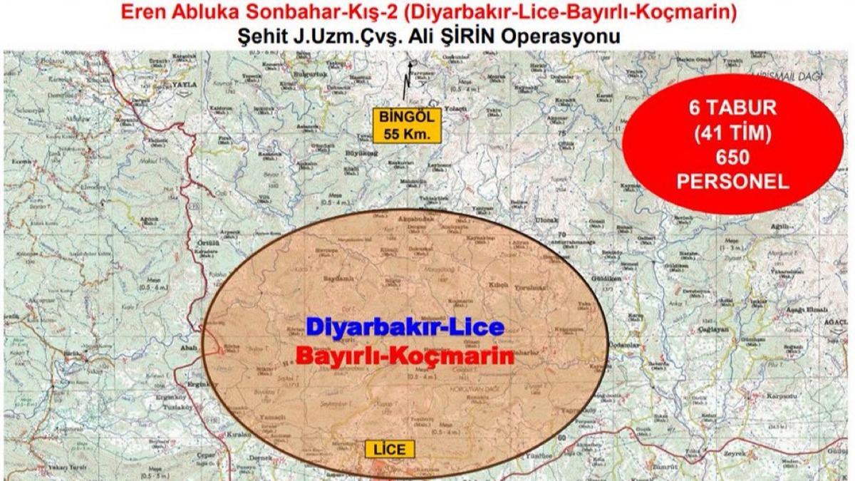 Bakanlıktan yapılan açıklamaya göre, terör örgütü PKK'yı ülke gündeminden çıkarmak için Lice-Bayırlı-Koçmarin ve Sağlık Mahallesi kırsalında "Eren Abluka Sonbahar Kış-2" Şehit Jandarma Uzman Çavuş Ali Şirin Operasyonu başlatıldı.
