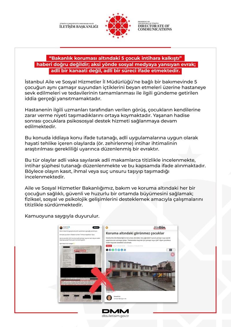 DMM'nin sosyal medya platformu hesabından konuya ilişkin yapılan açıklamada, İstanbul Aile ve Sosyal Hizmetler İl Müdürlüğüne bağlı bir bakımevinde, 5 çocuğun aynı çamaşır suyundan içtiklerini beyan etmeleri üzerine hastaneye sevk edilmeleri ve tedavilerinin tamamlanmasıyla ilgili gündeme getirilen iddianın gerçeği yansıtmadığı belirtildi.
