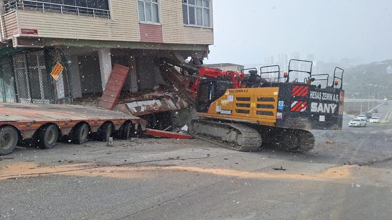 İş makinesiyle çekilen tırın binaya doğru kayması güvenlik kamerasınca da kaydedildi.