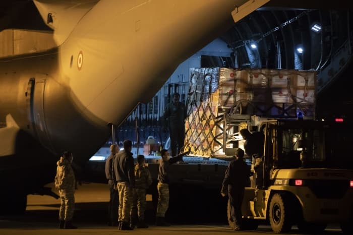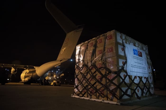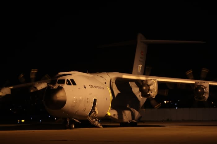 Cumhurbaşkanı Recep Tayyip Erdoğan'ın talimatı üzerine Milli Savunma, Sağlık, Sanayi ve Teknoloji bakanlıklarınca hazırlanan malzemeler, dün gece Etimesgut Askeri Havaalanı'nda A 400M tipi nakliye uçağına yüklendi.