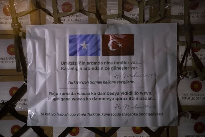 Üzerinde Cumhurbaşkanlığı forsu, Türkiye ve Somali bayraklarının yanı sıra Türkçe ve Somalice olarak Mevlana'nın, "Ümitsizliğin ardında nice ümitler var. Karanlığın ardında nice güneşler var." sözlerine yer verilen yardım malzemelerinin yüklenmesinin ardından havalanan uçak, Somali'ye ulaştı.