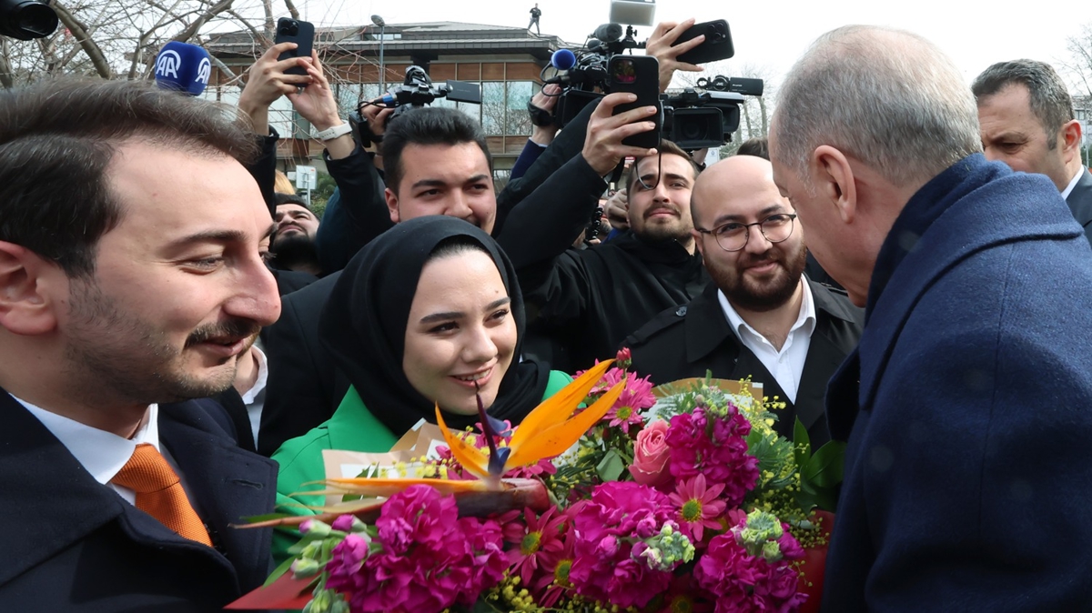 AK Parti İstanbul Gençlik Kolları Başkanı Muhammed Cem Çekerek, aracından inen Erdoğan'a üzerinde kendisinin resmi ile Türk bayrağının yer aldığı pastayı takdim etti.