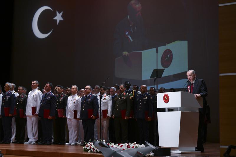 Milli Savunma Üniversitesinin (MSÜ) Yeni Levent Yerleşkesi'nde gerçekleştirilen 14'üncü Dönem Müşterek Komuta ve Kurmay Eğitimi ile Kuvvet Harp Enstitüleri 7'nci Dönem Komuta ve Kurmay Eğitimi Mezuniyet Töreni'nde konuşan Erdoğan, savunma sanayi teknolojisi alanında yapılanlara dikkati çekti.