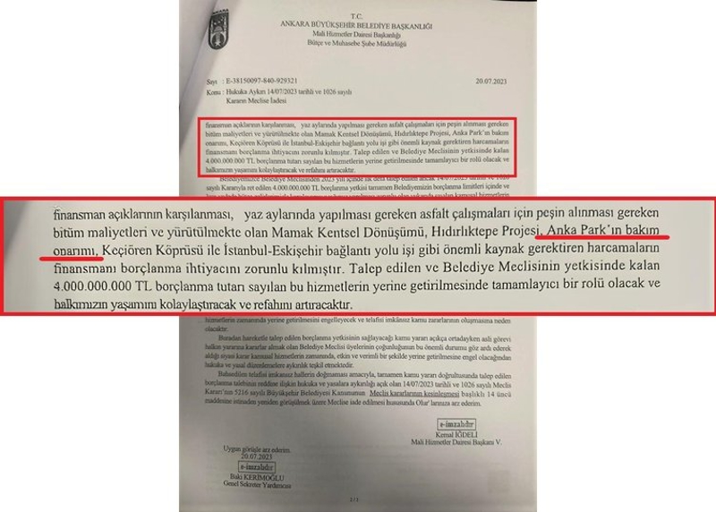 İlk önce "EGO zarar ediyor" ardından "Personel maaşlarını ödeyeceğim" diyerek ABB meclisinden 4 milyar 300 milyonluk borçlanma yetkisi olmasına rağmen 4 milyarlık başka bir borçlanma yetkisi isteyen Ankara Büyükşehir Belediyesi Başkanı Mansur Yavaş, istediğini alamayınca şimdi de 4 buçuk yıldır kaderine terk ettiği Ankapark'ın 'bakım onarımı yapacağım' diyerek meclisten yetki istedi. Yavaş'ın borçlanma yetkisi için yaptığı oyunları AK Parti Ankara İl Başkanı Hakan Han Özcan belgesi ile açığa çıkardı.
