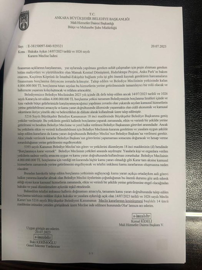 Sabah'ın haberine göre, AK Parti Ankara İl Başkanı Hakan Han Özcan, "Geçtiğimiz ay ilk 4 milyar TL'lik borçlanma yetkisi isteği ABB meclisine geldiğinde 'EGO'nun taşımalarında zarar ettiği, bütçe açığı oluşması halinde bu paranın oraya transfer edileceği ve bu bütçe açığının kapatılacağı' söylendi. Plan ve Bütçe Komisyonumuz da bunun detaylandırılmasını istedi. Bu isteğin ardından Mali Hizmetler Dairesi Başkanlığı, 'Şu anda ihtiyacımız yok. Olursa kullanmak için istiyoruz' diyerek cevap verdi.
