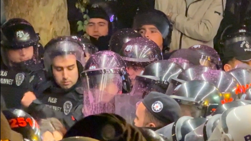 Polis tarafından etrafı çevrilen gruptaki bazı eylemciler polise biber gazı sıkarak boya fırlattı.