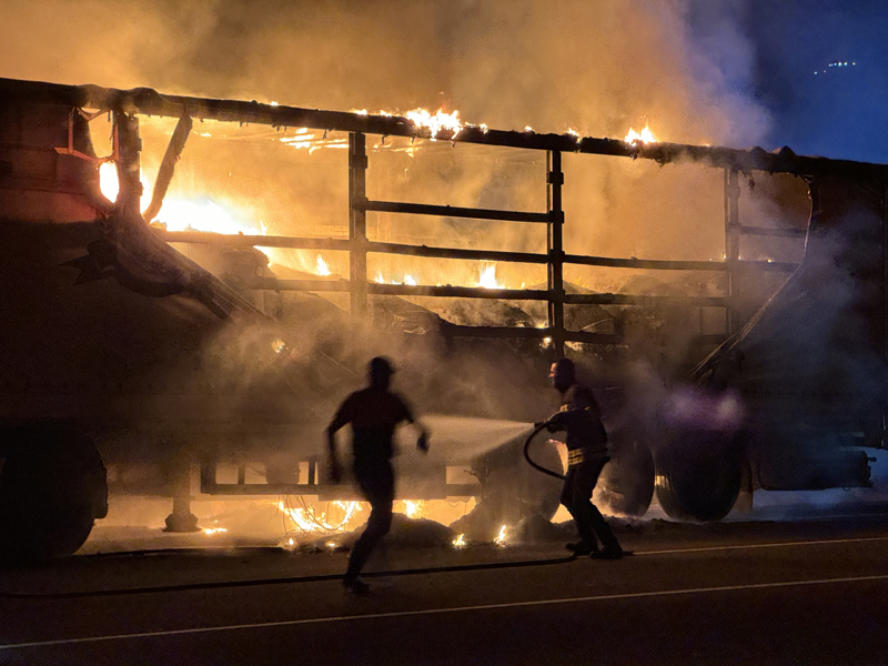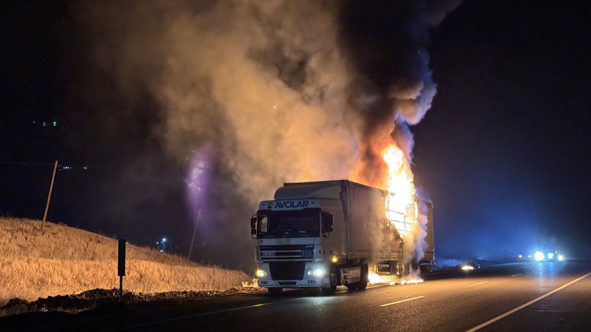 Yangını fark eden sürücü, tırı yolun kenarına çekerek durumu itfaiyeye bildirdi.