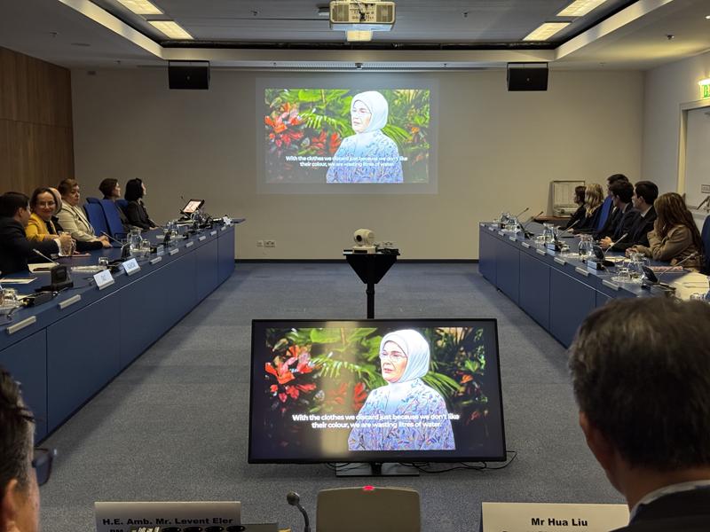 Türkiye'nin Avrupa Birliği (AB) nezdinde Daimi Temsilcisi Büyükelçi Faruk Kaymakcı'nın ev sahipliğinde Brüksel'de düzenlenen etkinlikte FAO AB ve Belçika İrtibat Ofisi Direktörü Raschad Al-Khafaji, Brezilya'nın AB Büyükelçisi Pedro Miguel da Costa e Silva, AB Komisyonu Çevre Genel Müdürlüğü Direktörü Aurel Ciobanu-Dordea, BM Çevre Programı Brüksel Ofisi Başkanı Veronika Hunt Safrankova ve Avrupa Giyim ve Tekstil Konfederasyonu (Euratex) Genel Direktörü Dirk Vantyghem konuşmacı olarak yer aldı.