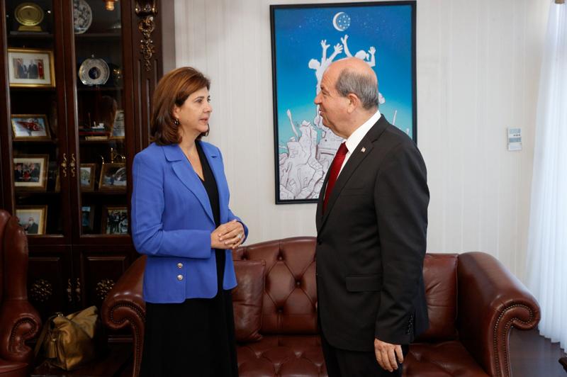 Tatar, ocak ayındaki ziyaretinin ardından dün tekrar Kıbrıs'a gelen Birleşmiş Milletler (BM) Genel Sekreteri Antonio Guterres'in Kıbrıs Şahsi Temsilcisi Maria Angela Holguin Cuellar'ı KKTC Cumhurbaşkanlığında kabul etti.