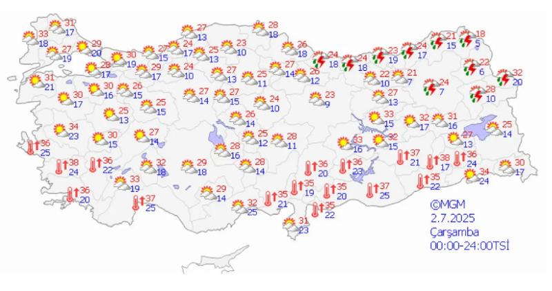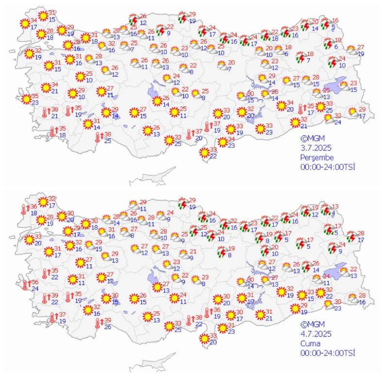 Meteorolojiye göre Doğu Karadeniz kıyıları, Ordu çevreleri ve Doğu Anadolu'nun kuzeydoğusunda sağanak ve gök gürültülü yağış bekleniyor. Trabzon'un batısı ile Giresun'un doğusunda yağışların yerel olarak kuvvetli olacağı tahmin ediliyor.