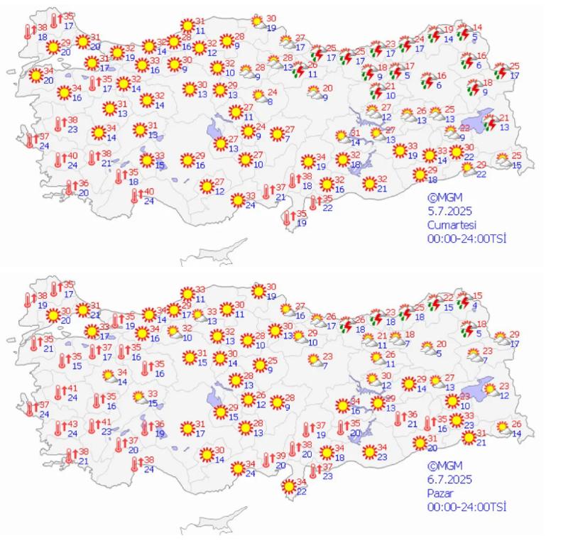 Meteoroloji Genel Müdürlüğü son dakika güncel hava durumu raporunu yayımladı. Buna göre, yarından itibaren hava sıcaklıklarının daha da yükselmesi beklenirken hafta sonu özellikle Ege ve Akdeniz'de termometrelerin 40-41-43 dereceleri göstereceği belirtildi.