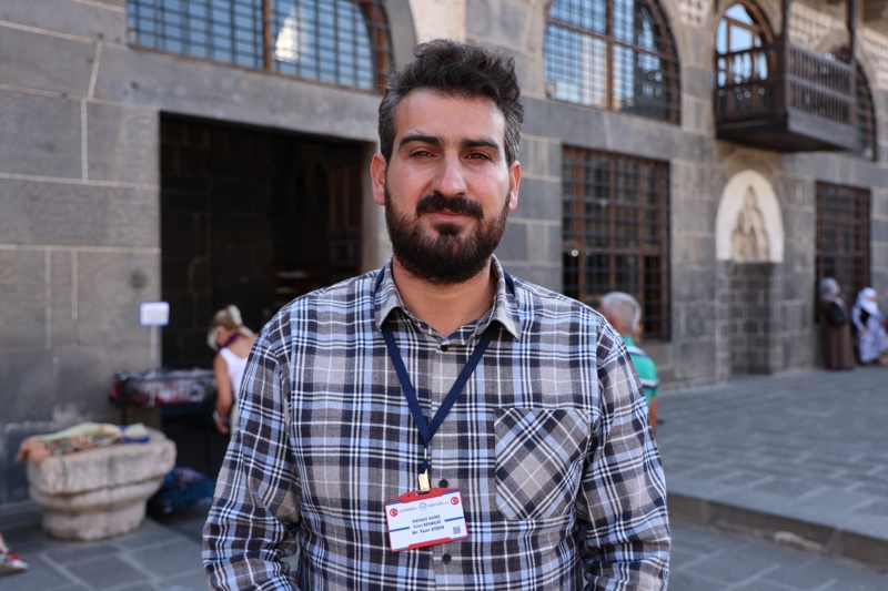 "Geldikleri zaman, camimizin girişinde giyiniş kurallarıyla alakalı oluşturmuş olduğumuz 6 dilde panomuz bulunuyor. Ziyaretçiler içeri girdikleri zaman başörtü ihtiyacı olan misafirler başörtü alarak cami ziyaretlerine başlıyorlar. Yabancı grupları çoğunlukla ağırladığımız sezonlar oluyor. Bu süreç içerisinde geçen hafta Bursa'da renkli görüntüler şahitlik ettik. Aslında o görüntülerde Diyarbakır Ulu Cami'sinde 5 yıl içinde birçok kez karşılaştığımız görüntüler olduğunu ifade edebilirim."